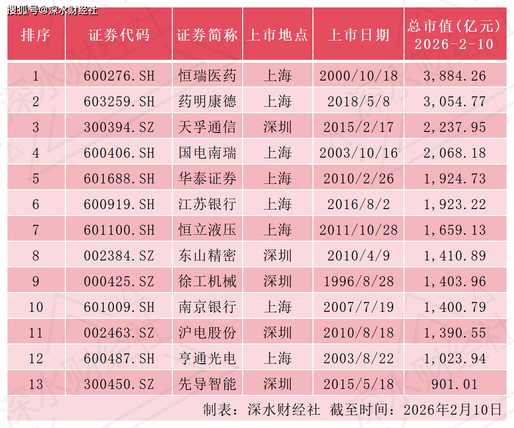 按照深水财经社发布的《江苏A股上市公司成长演讲》,截至2026年2月11日,江苏已有12家A股公司市值冲破千亿,别离是恒瑞医药、药明康德、天孚通信、国电南瑞、华泰证券、江苏银行、恒立液压、东山细密、徐工机械、南京银行、沪电股份、利市光电。